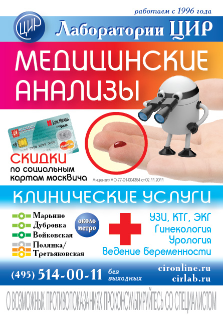 Увидели рекламу ЦИР? Сфотографируй стенд с рекламой ЦИР и выложи у себя на страничке в Вконтакте или в Facebook! Добавь комментарий "Почему нравится ЦИР" и получи скидку в размере 10% на услуги клиник и лабораторий ЦИР.*