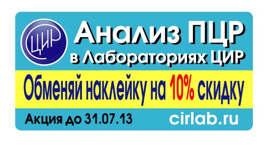 С 10 июня ООО "Лаборатории ЦИР" и ООО "Болеар Медика" проводят совместную акцию: всем покупательницам тестов Frautest предоставляется 10% скидка на анализ ПЦР. Ищите наклейку на упаковке и обменяйте её на скидку при оплате анализа в клиниках ЦИР. Тесты можно приобрести в аптеках Москвы. Акция действует до 31 июля 2013 г. Спешите!