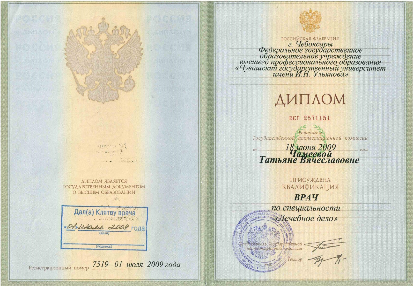 2009 г. - ФГБОУ ВО «Чувашский государственный университет им. И.Н. Ульянова», «лечебное дело»