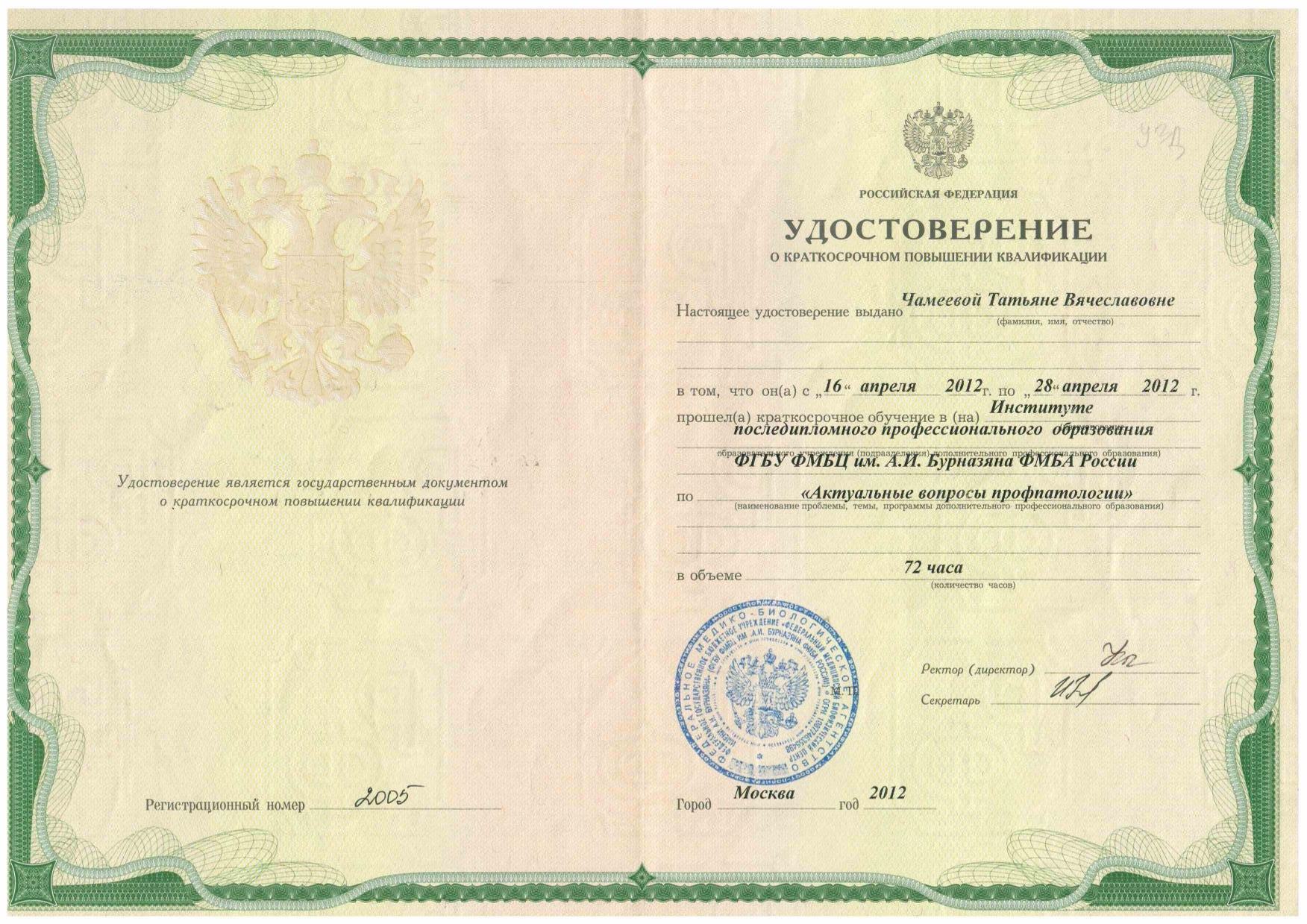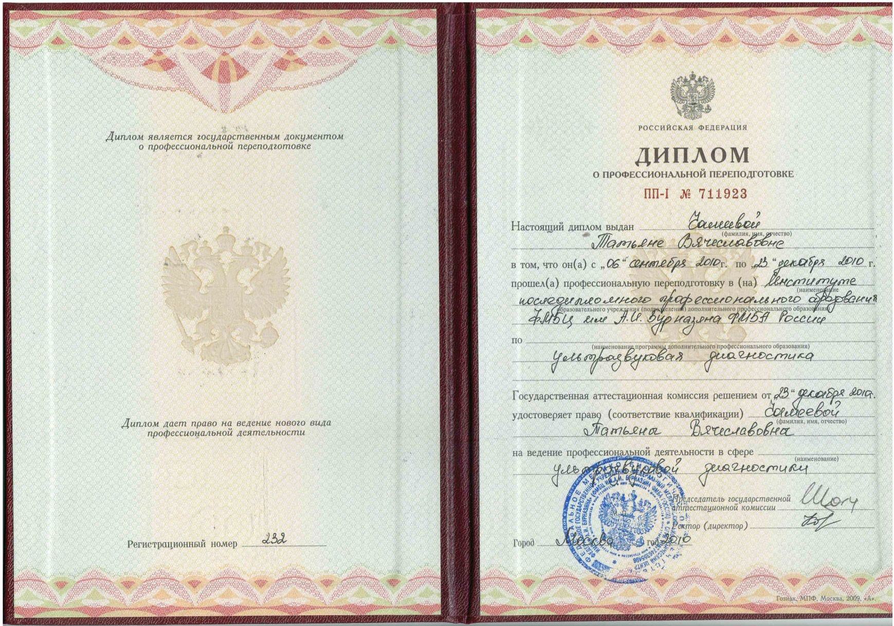 2010 г. – профессиональная переподготовка по ультразвуковой диагностики, институт последипломного профессионального образования ФМБЦ им. А. И. Бурназяна ФМБА России