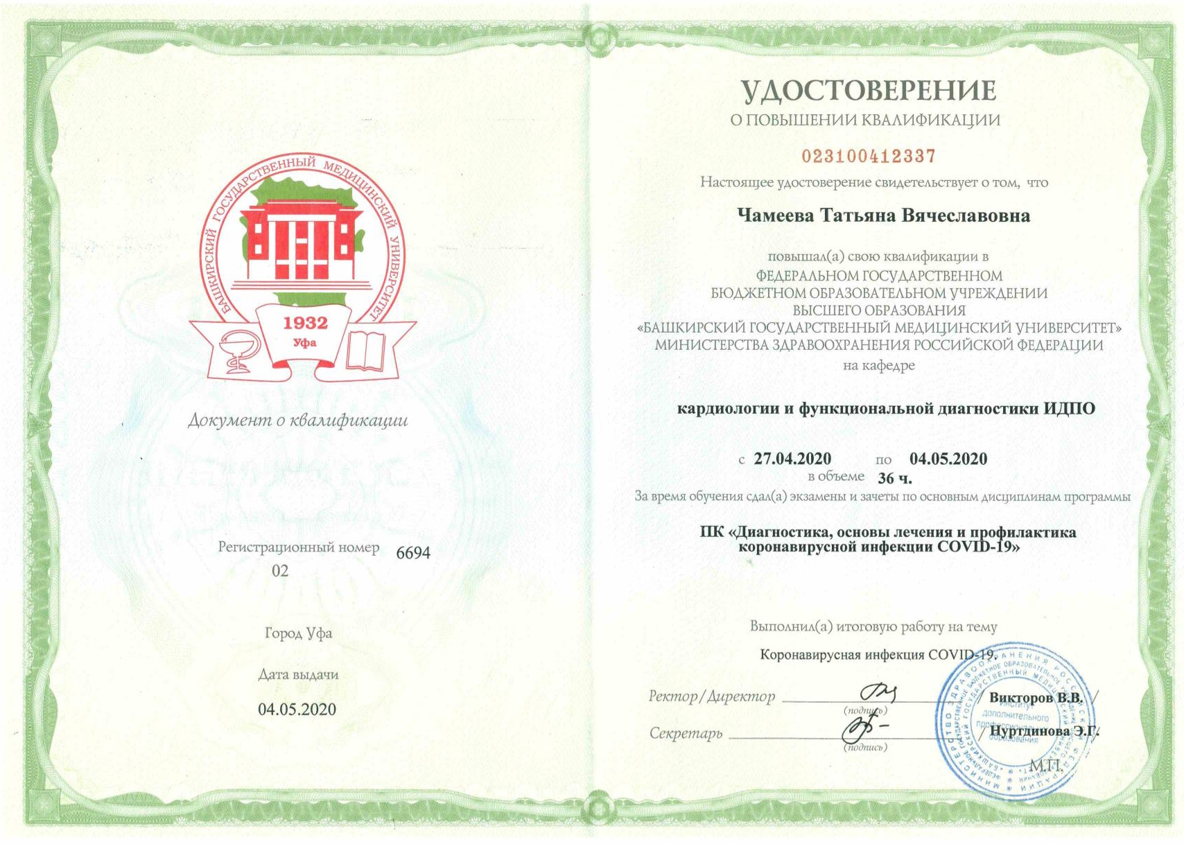 2011 г. - "Эхокардиография плода. Трехмерная эхография и допплерография в акушерстве" ФГОУ ДПО "Институт повышения квалификации ФМБА России"