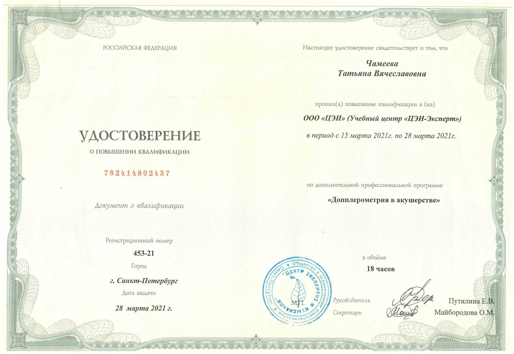 2021 г. - Учебный центр «ЦЭИ-Эксперт» по «Допплерометрия в акушерстве»