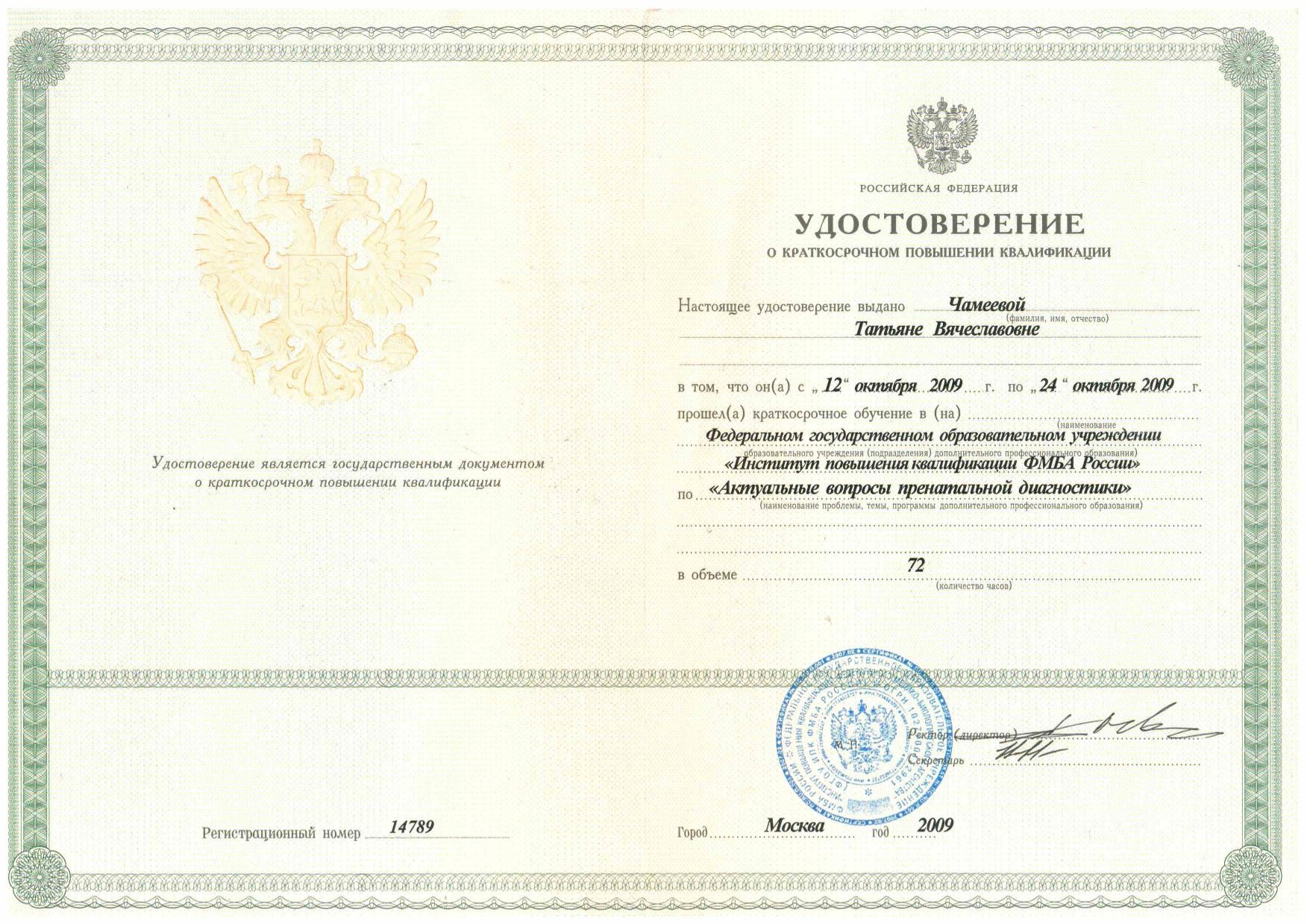2009 г. - «Актуальные вопросы пренатальной диагностики» Институт повышения квалификации ФМБА России