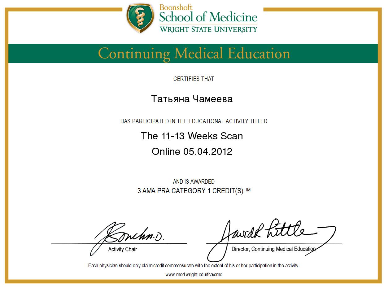 2012 г. - Сертификат Фонда Медицины Плода FMF подтверждающий соответствие требованиям проведения УД на сроке 11-13 недель беременности (FMF, www.fetalmedicine.com)
