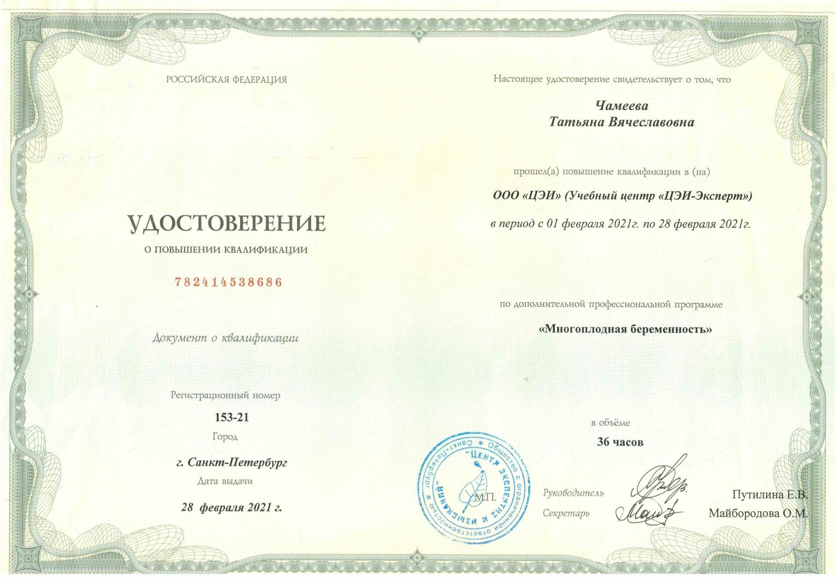 2021 г. - Учебный центр «ЦЭИ-Эксперт» по «Многоплодная беременность»