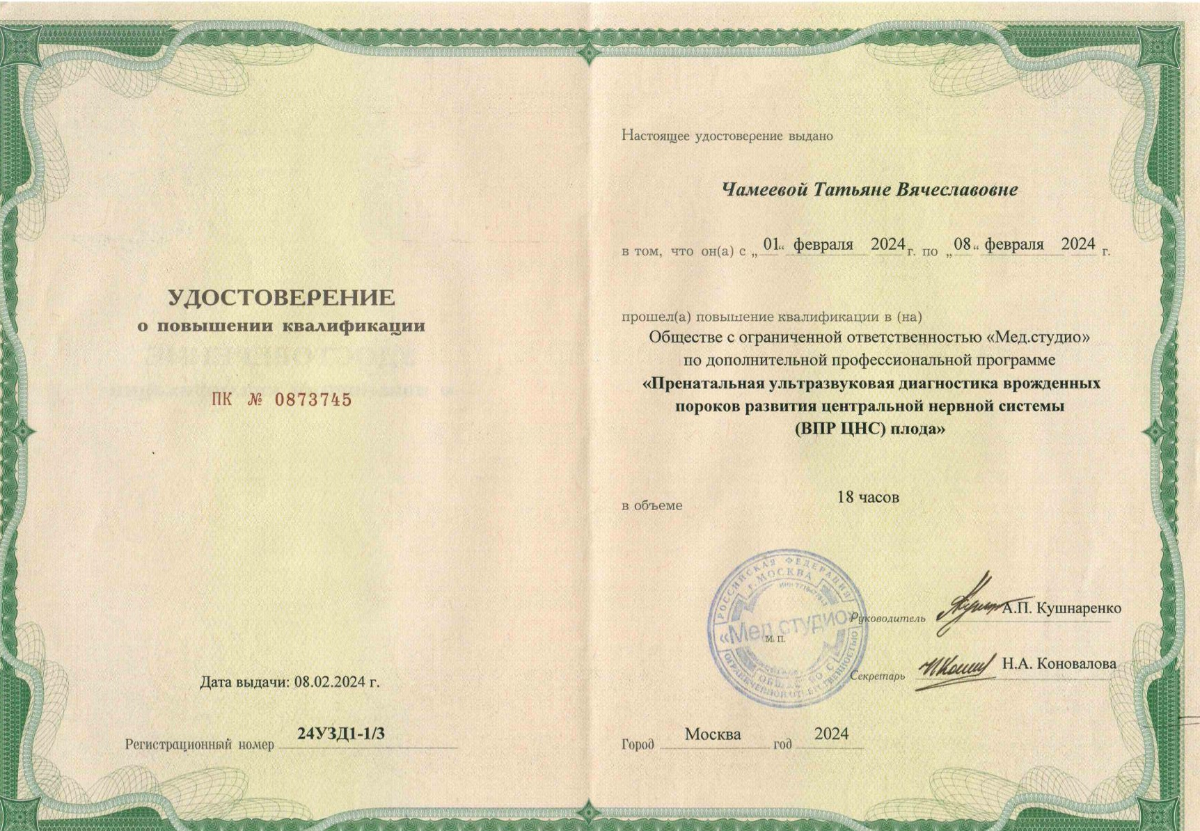 2024 г. – ООО «Мед.студио» по «Пренатальная ультразвуковая диагностика врожденных пороков развития центральной нервной системы (ВПР ЦНС) плода»
