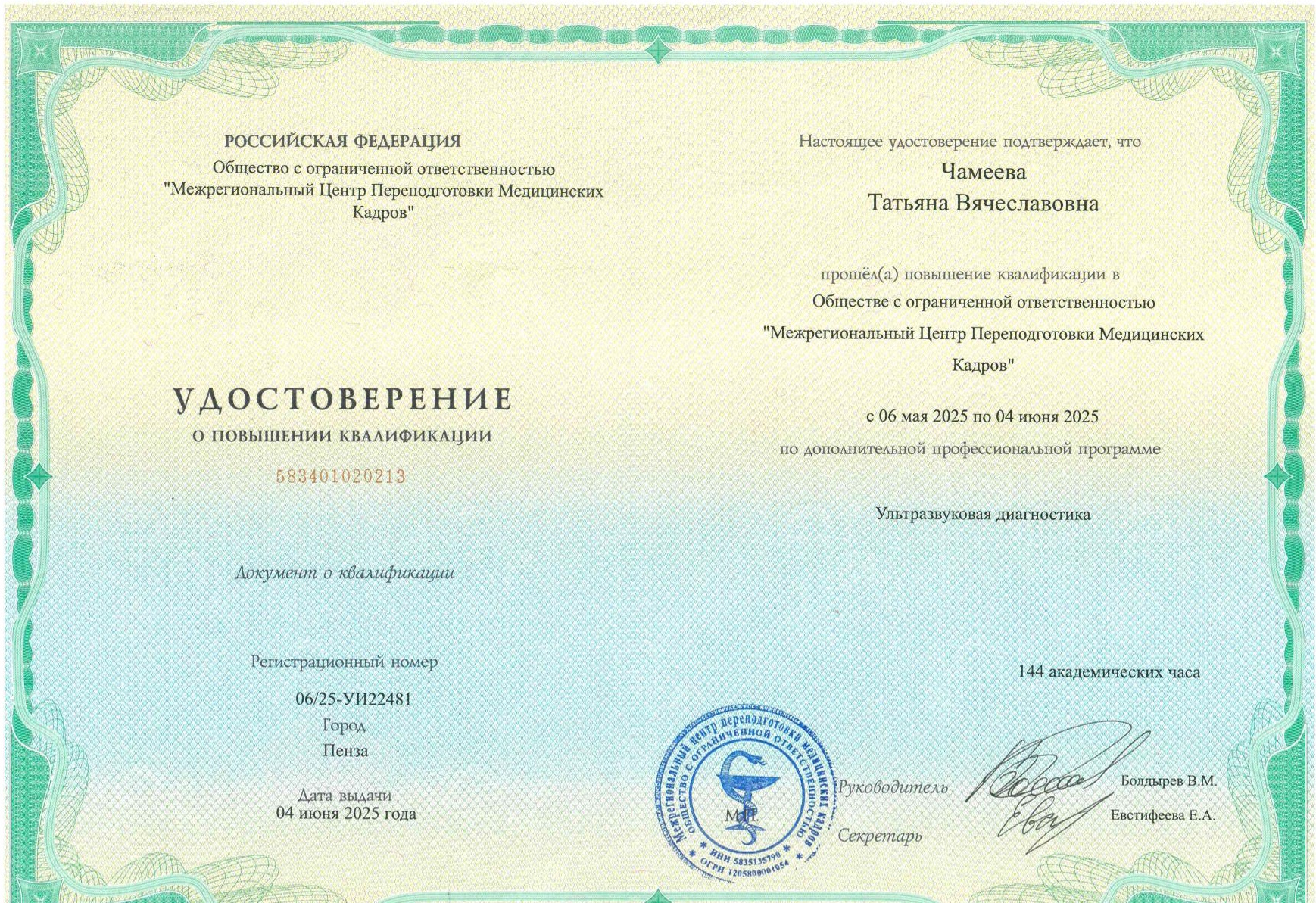2025 г. – «Ультразвуковая диагностика» ООО «Межрегиональный центр Переподготовки медицинских кадров»