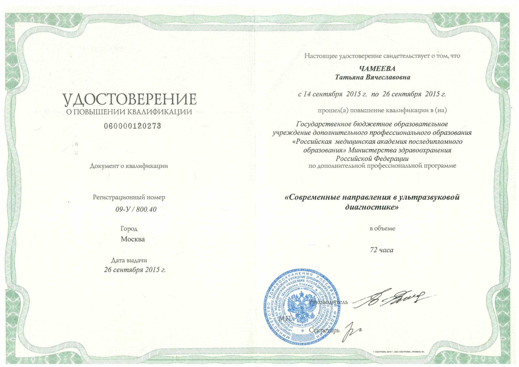 2015 г. - "Современные направления в ультразвуковой диагностике" ГБОУ ДПО "Российская медицинская академия последипломного образования"