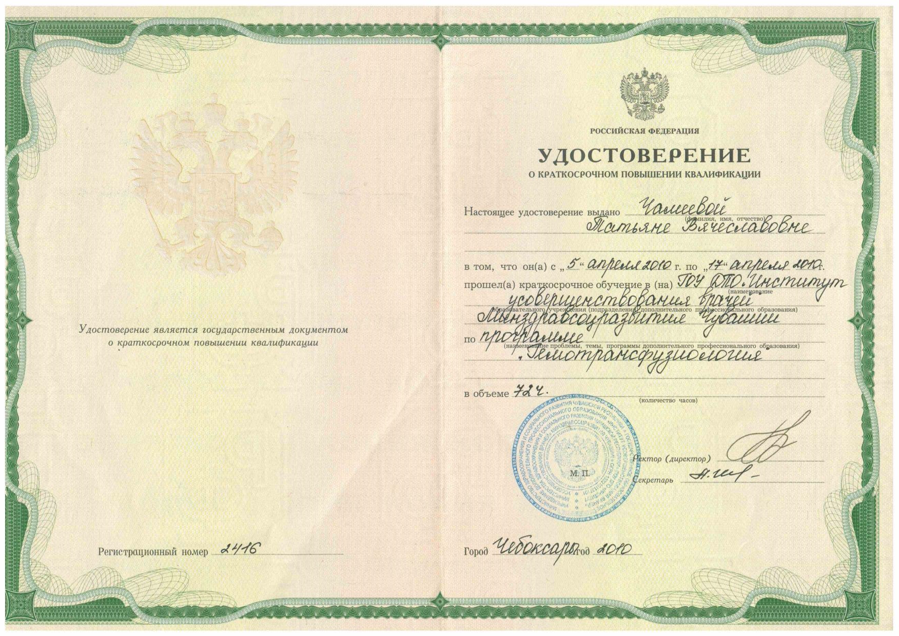 2010 г. - Клиническая интернатура по специальности «Акушерство и гинекология» на базе ГОУ ДПО «Институт усовершенствования врачей» г. Чебоксары