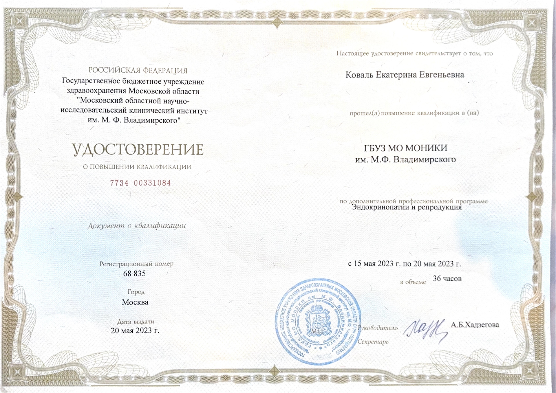 Цикл "Эндокринопатии и репродукция" 36 часов в 2023 г. на базе ГБУЗ МО МОНИКИ им. М.Ф. Владимирского.