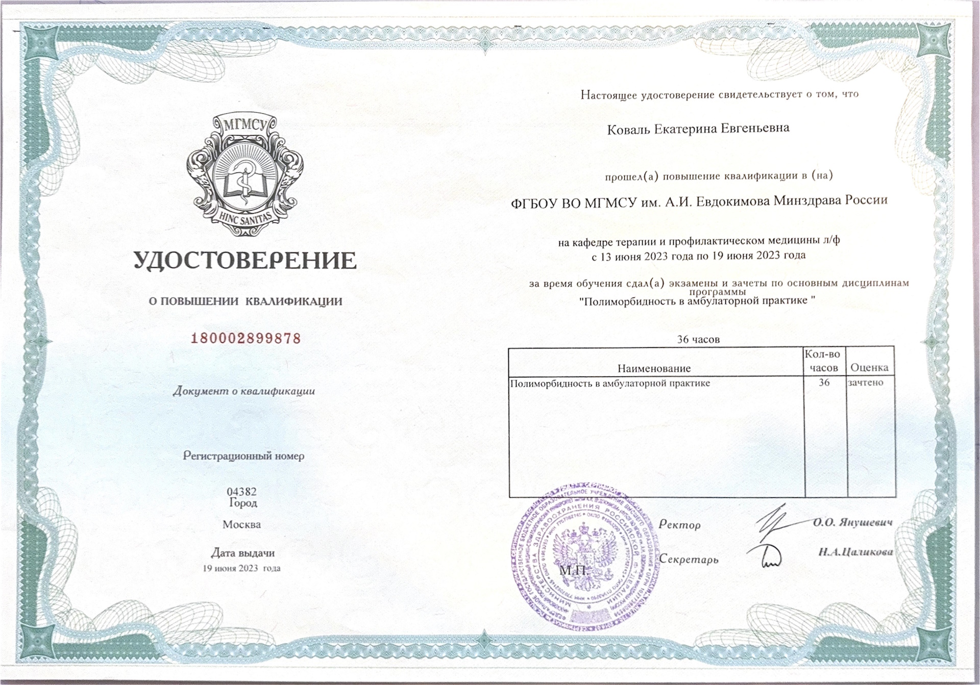 Цикл "Полиморбидность в амбулаторной практике" 36 часов в 2023 г. на базе ФГАОУ ВО МГМСУ им. А.И. Евдокимова