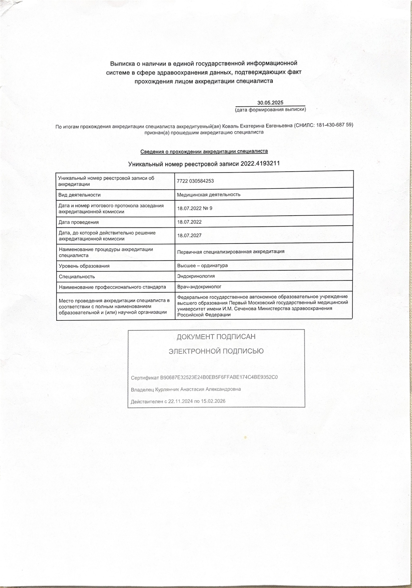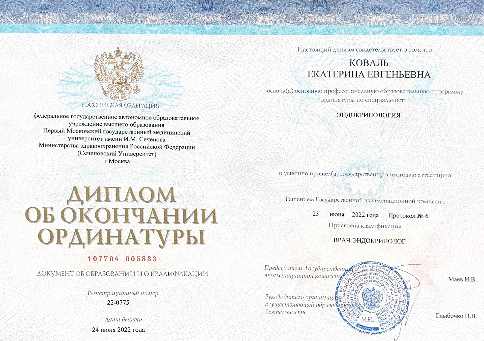 Ординатура по эндокринологии в ФГАОУ ВО Первый Московский государственный медицинский университет им. И.М. Сеченова, 2020-2022 г., Ординатура «Эндокринология»