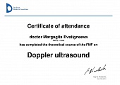- Сертификат Фонда Медицины Плода FMF, подтверждающий соответствие требованиям проведения доплерометрии, 2014 г. (FMF, www.fetalmedicine.com)