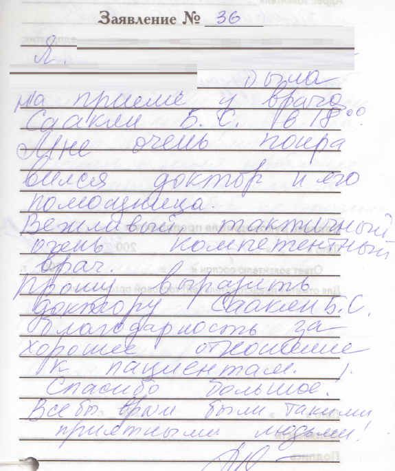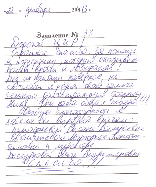 Выражаю свою благодарность Гузову И.И. за высококвалифицированный подбор персонала, а именно Гамит Алена Анатольевна. Это человек, который относится к выполнению должностных обязанностей и трудовой функции не как к формальности. Она действительно "ведет" своих пациентов, к ней можно обратиться с любым вопросом и получить ответ высочайшей компетенции. Я пришла в ваш центр не имея веры врачам и без всякой надежды на будущее (семья на грани разрыва). Алена Анатольевна помогла справиться с моими акушерско-гинекологическими проблемами, помогла забеременеть и сохранить долгожданную и желанную беременность. Еще раз выражаю Вам свою благодарность за каждодневный труд и заботу о своих пациентах. Прошу Вас отдать распоряжения о вынесении благодарности Гамит А.А. по приказу (по личному составу), а также с занесением благодарности в трудовую книжку сотрудника.