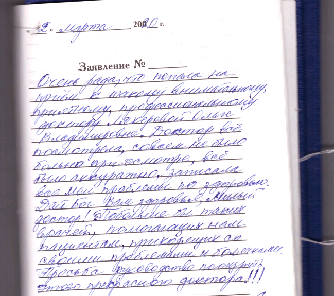 Очень рада, что попала на прием к такому внимательному, приятному профессиональному доктору Ляхеровой Ольге Владимировне. Доктор все посмотрела , совсем не было больно при осмотре, все было аккуратно, записала все мои проблемы по здоровью. Дай Бог Вам здоровья , милый доктор! Побольше бы таких врачей, помогающих нам, пациентам, приходящих со своими проблемами и болячками. Просьба руководство поощрить этого прекрасного доктора!!!